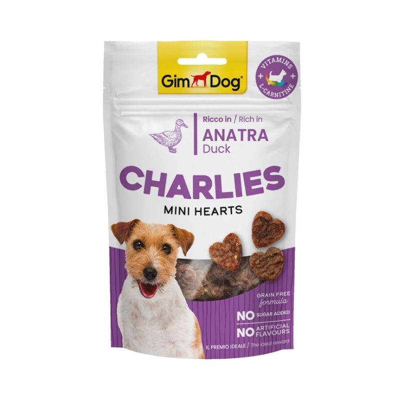 Gimdog Charlies Mini Hearts Ördekli, tüylü dostlarınızın sağlıklı bir günlük mola vermesi için geliştirilmiş lezzetli, yüksek protein içerikli atıştırmalıklardır! Birkaç basit bileşenden oluşmaktadır. Şeker, tahıl ve yapay tatlar içermez. L-Karnitin sayesinde, sportif köpekler için de idealdir.